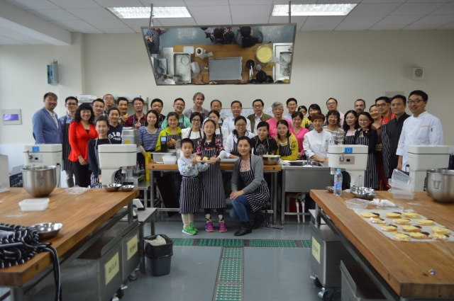 简短参观后,全系一行人进入烘焙实训中心,在学院专业西点师指导下,分为六组,亲手学习实践制作巧克力手指饼。平日里专心治学的法语系教职工们,做起烘焙也一样专心致志,且热情高涨。窗外细雨微凉,教室里热火朝天。大家有人笨手笨脚,有人手脚麻利,大家通力合作,其乐融融,充满欢声笑语。时至午时,烘焙学习实践如期结束,六组学员都较为出色地制作出了令人满意且十分难忘的手指饼。全体人员齐聚讲台合影留念。
