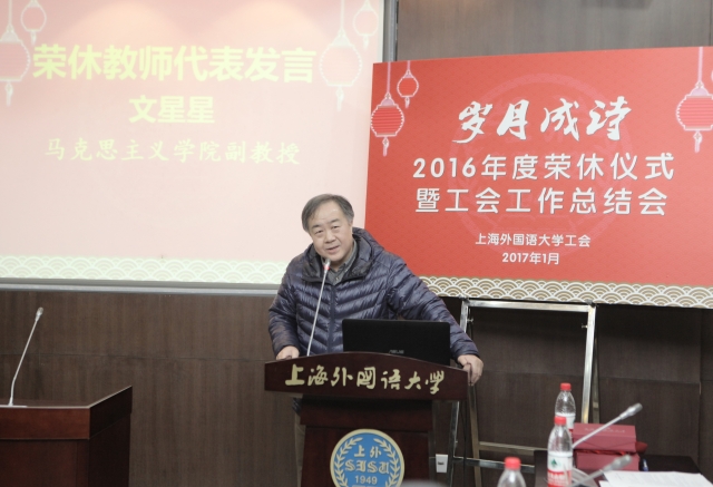 在荣休仪式上,校工会常务副主席于朝晖一一宣读了2016年度55位退休教师名单,荣休教师依次领取了象征吉祥的红围巾和荣休纪念牌。研究生部刘旭婷、对外合作交流处赵牧作为青年教师代表深情并茂地朗诵了《我耕耘》,表达了全校师生对荣休教师们的诚挚感谢和崇高敬意。马克思主义学院文星星副教授作为荣休代表发言,用朴实无华的语言表达了对自己三十多年教师工作的恋恋不舍、对学校工会的感谢,对上外发展的美好祝愿。文教授的发言字字用情、感人肺腑。