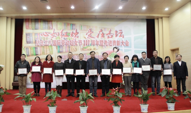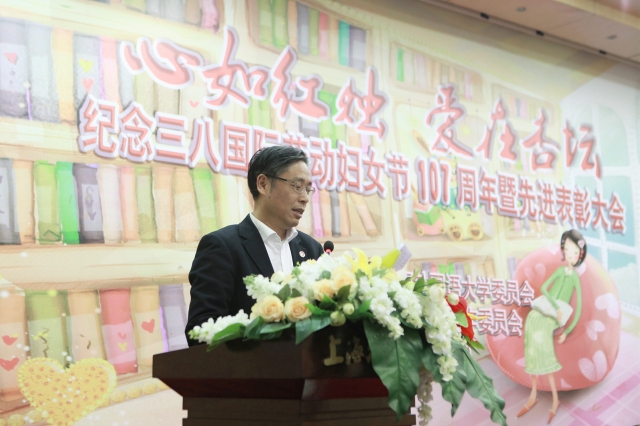 3月10日下午,校妇工委、校工会女职工委员会在虹口校区第一报告厅隆重举行“心如红烛 爱在杏坛”——纪念三八国际劳动妇女节107周年暨先进表彰大会。虹口区妇联党组书记、主席孙敏,校党委书记姜锋,校党委副书记王静、钱玲,副校长冯庆华,校妇工委主任于朝晖等出席。校妇工委常务副主任顾蔚主持大会。全校各院系部门负责人、获奖个人和集体代表等100余人参加了会议。