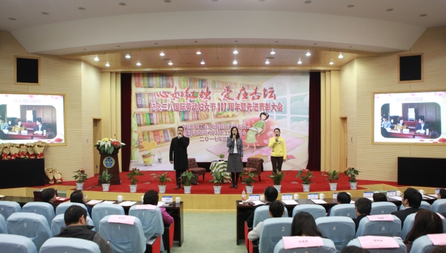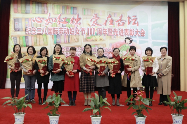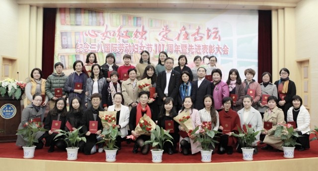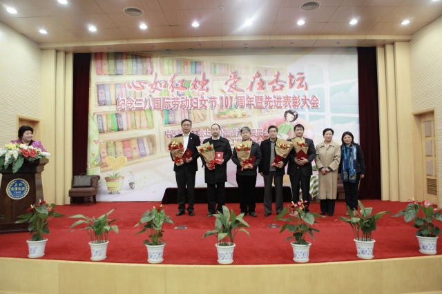 王静副书记宣读了《关于表彰2015—2016年度校“三八红旗手”(集体)、优秀妇女工作者的决定》。会上,荣获上海市、教育系统、校级“三八红旗手”(集体)和校级优秀妇女工作者等先进个人和集体受到表彰。王静副书记、钱玲副书记为获奖集体和个人颁奖。上海市三八红旗手、日本文化经济学院院长许慈惠教授,上海市三八红旗集体代表、出国人员培训部及海外合作学院党总支书记张缅在会上分享了她们的工作成果和教书育人心得体会。