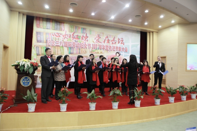 最后,上海市教育系统三八红旗集体、高级翻译学院表演了精彩节目。高翻学院副院长吴刚和张爱玲院长朗诵了其创作的诗歌《心之路》,高翻学院全体教职工演唱了《同一首歌》,将大会气氛推向高潮。