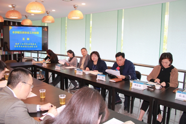 4月12日上午,2018年上半年教工文体协会工作推进会议在虹口校区教工之家召开。校工会常务副主席于朝晖,体教部主任、教工文体协会总会长王骏,协会理事衣永刚、各协会会长、秘书长等30余人出席会议。会议由文体协会秘书长杨浩主持。